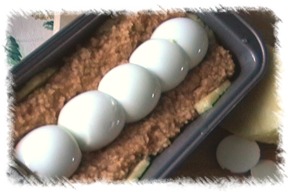In a loaf pan, line bottom and sides with fresh pineapple slices. Spoon half of the mixture into pan. Place peeled hard boiled eggs in a row on top of lentil mixture. If you like you can slice off the tip of each egg so that the yolk will appear in each slice.