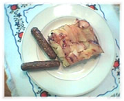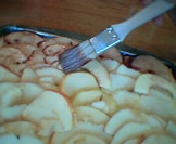 Cut apples in half and thinly slice leaving peels on. I use my food processor with a slicing blade. Begin at one end of the pan and layer the apple slices down three rows, overlapping slightly. Melt the preserves in the microwave (about 30 seconds) and then brush over the top of the apple tart before baking. If you like you can also brush melted margarine on the top of the tart just before placing it in the oven. Bake at 350 degrees for 25 minutes. Serve warm or cold. |