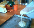In a large bowl combine oat flour, walnut meal, oats, baking powder and salt. Mix together dry ingredients and then quickly add all of the soy milk at one time. Mix with a wooden spoon. The batter will initially be very thin. Pour into a greased jelly roll pan (approx. 14" x 10"). As you prepare the apples, batter will thicken in the pan.