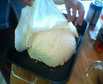 Remove the weight from your tofu mold and discard any of the milky water that has been pressed out of your roast. Remove the plastic wrap and spoon your stuffing mixture into the tofu bowl. Crumble your last tub of tofu over the top of your roast. Press down gently with both hands to make sure the stuffing is set. Very carefully, place your roasting pan atop the colander and turn it upside down. Remove the cheesecloth.